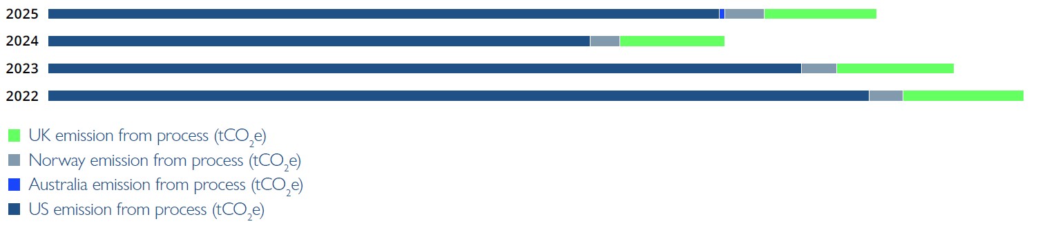 Between 2020 and 2025, process emissions across our operations continued to trend downward, with total emissions falling from around 227 tonnes in 2022 to just over 193 tonnes in 2025. The most substantial long-term reductions were achieved in the United States, where emissions declined significantly between 2022 and 2024 before partially rising again in 2025 while remaining well below 2022 levels. Australia, Norway, and the UK showed relatively small year-to-year variations but maintained overall stable performance. These results reflect the impact of our initiatives to strengthen monitoring, streamline processes, and reduce waste at the source, contributing to more efficient and sustainable operations over time.